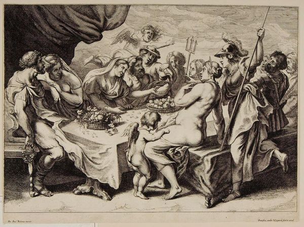 Curator: Looking at this print, titled *Taking in Travellers* by François Hutin, I’m struck by the density of the etching—almost claustrophobic. Editor: Indeed. Notice how the artist uses the etching technique to create a composition that feels both classical and somewhat gritty, focusing on the labor of the scene. What materials would have been available? What social class do these people belong to? Curator: It’s intriguing. The interplay of light and shadow sculpts the figures, emphasizing their forms and the narrative unfolding. There is a strong central composition with a clear hierarchy of figures. Editor: The material reality—etching on a metal plate, presumably copper—allows for this kind of reproduction. And consider the social implications of hospitality, of providing for those who travel. Curator: True, the act of providing sustenance becomes a central theme, rendered with such immediacy through Hutin's technique. Editor: Precisely. By focusing on the production and consumption within the artwork, we can expand our understanding of its broader cultural value. Curator: Absolutely. It's a visually rich image that also prompts reflection on the social dynamics it portrays. Editor: Yes, and I am more aware of how art can be made from this exchange.