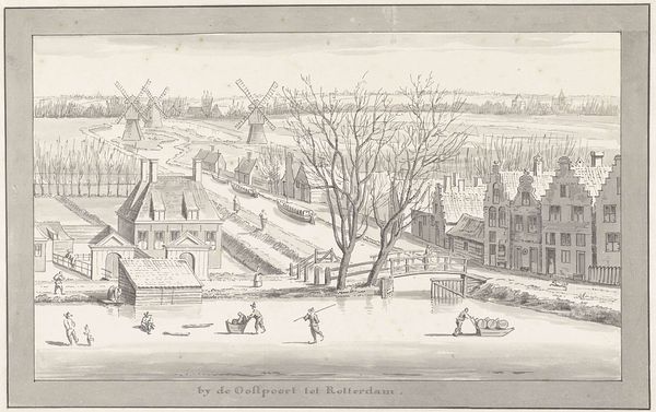 Editor: We're looking at "Siege of Haarlem, 1572-1573" by Hendrik Spilman, an etching printed sometime between 1742 and 1779. The scene is quite detailed, depicting the layout of a city under siege, and what strikes me most is the geometric rigidity of the landscape and architectural elements. How do you interpret this work, with its formal style? Curator: Indeed. Let us analyze its composition through a formalist lens. Observe how the image is structured, bisected by the horizon line, creating distinct upper and lower registers. Consider also how the artist creates depth through precise delineation and graded contrasts rather than tonal gradations. It seems the organization of pictorial space operates according to strictly logical geometric principles. Editor: So, would you say that the subject matter is secondary to the form? Is the print's formal execution perhaps conveying something about the Dutch Golden Age and the power structures within it? Curator: The medium itself, etching, lends to this meticulous, structured approach. What visual impact do you think results from the artist's decision to render this landscape, a presumed "real world," through such rigid structures? Do you find a relationship between its formal qualities and its narrative purpose? Editor: I think it really draws your attention to the strategic positioning of elements within the print. I notice that this meticulous structuring can communicate a message of calculated control, as opposed to merely documenting an event. Thank you! Curator: Yes. Reflecting on the artist's methodical hand provides profound insight into the broader intellectual landscape that birthed the piece. I too, have valued our interchange!