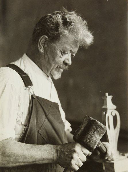 Curator: Rudolf Eickemeyer's photograph, "The Basketmaker," rendered in gelatin silver, offers a study in textures and tones. Notice how the subtle gradations of light define form. Editor: The overall mood is undeniably one of quiet labor and, dare I say, a kind of romanticized rural life, typical of Arts and Crafts era aesthetics. It’s very constructed. Curator: Agreed. Look closely at the tonal arrangement. The composition uses a limited palette to accentuate the tactile nature of the baskets themselves. It brings a strong visual and structural element, almost stark in its simplicity. Editor: I find it fascinating how Eickemeyer stages this image to evoke a particular sensibility, reflecting back to a time before rapid industrialization. The image clearly emphasizes handcrafted production, offering commentary on value in a modernizing society. Curator: Structurally, the basket is the clear focal point. The weave creates visual interest, while the seated man and light pouring in draw us deeper into the scene's form. Editor: Absolutely, and consider this aesthetic within a history of American art. We have an idealized image of rural life—a common visual trope. There’s a commentary here on the vanishing artisan class, particularly if the basket maker comes from Indigenous communities who have been pushed further from land and their traditions by white settlers. The romanticizing, thus, can become deeply complicated. Curator: Do you think then, there’s a tension between the aesthetic harmony and what you interpret as that societal unease, disrupting what would otherwise be pure beauty? Editor: I believe so. This photographic study isn't simply about surface beauty; it's subtly implicated in complex issues concerning labor, tradition, and representation, consciously or not. These layered readings emerge when engaging art through historical lenses. Curator: The structure gives form, yet the contextual considerations yield nuance. Both necessary for true understanding. Editor: Precisely. Looking deeper reveals not just craft, but social layers too.