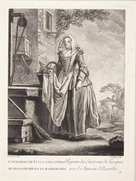 Pierre Etienne Moitte created this print, "Kvinde fra Pisa", sometime in the 18th century. It depicts a woman from the Pisan countryside and offers a glimpse into the social dynamics of the time. The image is interesting, not just for what it shows, but also for how it portrays its subject. The woman is presented in a manner that blends elements of both the idealized and the real. We can consider how the print uses visual codes to communicate social status and regional identity. Made in Europe, this print reflects the era's fascination with capturing local customs and costumes. It's worth asking: How did the institutions of art, like academies and printmakers, shape the representation of ordinary people? Was this image intended to celebrate regional diversity, or to reinforce existing social hierarchies? To fully understand the print, we can turn to sources such as period travel accounts, costume books, and records from art academies. This will allow us to gain insights into the complex interplay between art, society, and identity in 18th-century Europe.