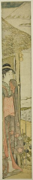 Curator: This beautiful, slender print is titled “The Love Letter,” and it’s attributed to Torii Kiyonaga, dating from around 1767 to 1799. We’re lucky enough to have it here at the Metropolitan Museum of Art. Editor: It's striking how the vertical format accentuates the elongated figures. And the subdued palette lends the whole scene a serene, almost melancholy, mood. I wonder about the physical process of making such a delicate thing. Curator: Kiyonaga was a master of Ukiyo-e prints. We should appreciate that this wasn’t some spontaneous creation—it would have involved a team of artisans, from the artist to the block carvers, to the printers themselves. Each colour would have been applied from a separate woodblock. Editor: That collaborative process is fascinating. The choice of textile patterns, too, seem very deliberate, perhaps indicating social status, marital eligibility. How was the use of specific textile designs policed or promoted during that period? Did guilds govern such things? Curator: It's more about symbolic communication, a sophisticated visual language for the viewers. Take the Kabuki theatre – popular entertainment influencing everything from hairstyles to fashion. Did you know Ukiyo-e prints were the mass media of their day? Editor: Like postcards! But elevated to art, because the materials mattered. How does this specific print fit within the Ukiyo-e tradition and broader societal norms? Are there other Ukiyo-e artworks focused on love letters from this period? And were these types of prints marketed at wealthy patrons? Curator: Well, you'd definitely find similar themes and figure types. What's so special about Kiyonaga is that he brings an understated sophistication. In some sense it’s genre painting that democratized imagery that was once reserved for the elites. And yes, many were marketed for a merchant clientele. Editor: Democratization through prints! Seeing those patterns, though, the wood grain—makes me wish I could analyze them in hand rather than from behind glass. Curator: I understand. Perhaps looking at the circumstances through which these works entered museum collections like ours would allow another fascinating angle of the materiality!