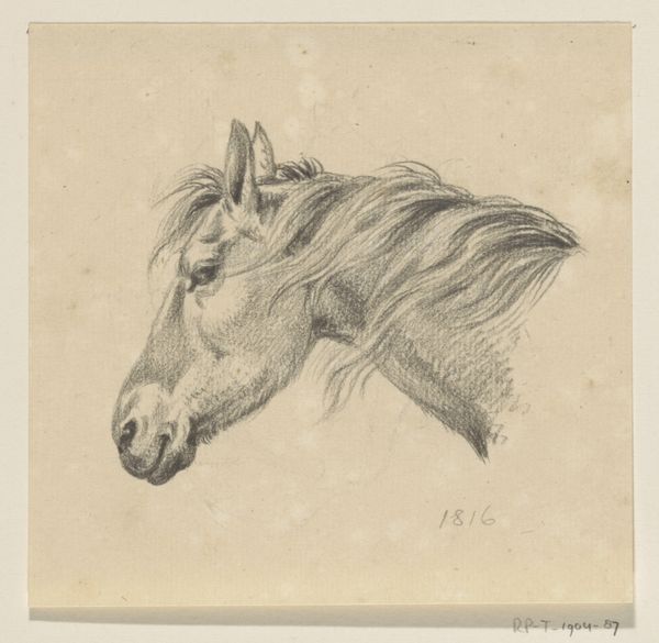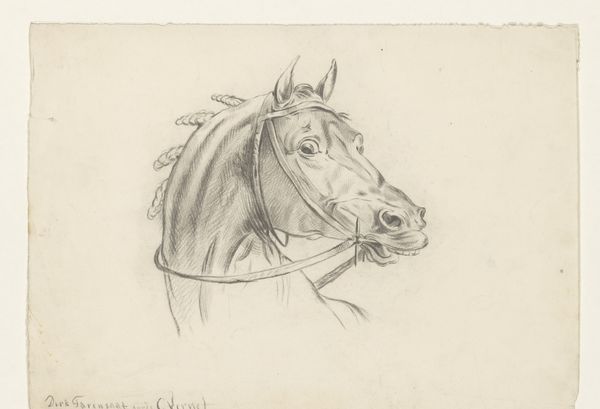 Curator: Here we have Johannes Tavenraat's "Hoofd van een paard, naar links," or "Head of a Horse, Facing Left," created sometime between 1819 and 1881. It’s a pencil drawing. Editor: Oh, I love this. There's something so gentle about the lines. It’s like he’s not just drawing a horse but capturing a fleeting thought. Almost melancholic. Curator: Indeed. Notice the subtle hatching used to define the contours and create a sense of volume, particularly around the horse's neck and cheek. The bridling is also rendered with delicate precision. Editor: Yes, but the eye... It's like a dark pool reflecting a bigger, sadder world. It reminds me of how animals seem to hold all the untold stories of human behavior. What do you think Tavenraat was aiming for? Curator: The work stands as an excellent example of academic realism. The artist’s mastery of anatomy and skillful use of light and shadow lend the subject a compelling sense of presence. This devotion to observable truth serves to make his subject more vital. Editor: See, I knew you'd get technical! I reckon he was feeling something when he drew this. You can’t spend that much time staring at a horse’s face without getting a sense of who they are. Maybe he saw his own reflection in that dark eye. You know, that feeling of being a noble beast yoked to something greater. Curator: A projection of the self, perhaps. Still, to consider this work primarily for its expressive value neglects the sophistication of Tavenraat's technical achievement, which provides a sense of corporeal reality. Editor: But isn’t that the point? Great art messes with you. It should feel real, like the air on your skin or a whisper in your ear. I think Tavenraat wanted us to meet this horse, not just analyze its lines. Curator: It is difficult to refute such intuitive conviction. It appears our discussion has created an aperture through which to behold this piece. Editor: Precisely! That little horse head there contains more thoughts than you think!