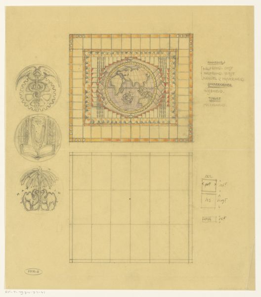 Editor: This is a design for a stained-glass window called "Ontwerp voor een glas in loodraam met een vrouwelijke personificatie", made after 1907 by an anonymous artist. The drawing depicts an elegant, classically-inspired window. I'm struck by how much it reflects Art Nouveau, but with a more ordered sensibility. As an iconographer, what stands out to you about the imagery here? Curator: It is fascinating how even within "anonymous" works, the zeitgeist breathes. Note the stylized female figure in the central medallion, she embodies ideals – Juno perhaps? And the way this imagery echoes throughout Western art history as emblems of virtue, strength, and beauty. These archetypes aren't just pretty pictures. They reflect and shape our cultural memory. How does the window's proposed location—presumably public or domestic—influence the reading of its symbolism, do you think? Editor: Hmm, the architectural setting would definitely play a role. If in a public building, like a library, that classical reference point signals knowledge. And it is translucent: the light flowing through that woman might also signify some sort of inner enlightenment or divine gift. It's designed for light after all. Curator: Precisely. Light isn't merely illumination; it is also revelation. Think of stained-glass windows in cathedrals: transforming mundane light into spiritual experiences. And the ornamental border with abstracted plant motifs. Have these details existed in art before, perhaps in pre-Christian symbols? Editor: Now that you mention it, I see similarities to Roman and Greek friezes in the linear plant elements. This image is part of a longer symbolic evolution. Thanks for drawing attention to all those connections! Curator: Symbols never appear in a vacuum. Examining those reverberations makes the artwork ever so richer.