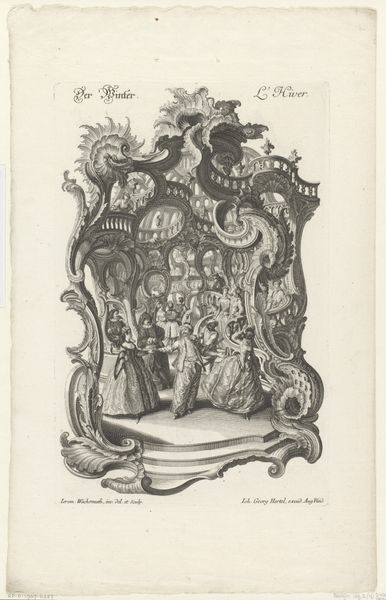 This is an anonymous line engraving titled "Two Pilgrims." We can see the artwork presents an intimate scene of courtship, framed by ornate, almost theatrical decorations. The figures, dressed in what appears to be period attire, suggest a narrative steeped in tradition and perhaps, a touch of romantic idealism. The woman is seated, and another woman is crouched by her knees, while the man extends his hand towards her, possibly in a gesture of proposal or commitment. Given the title, their garb, and the framing, we can consider the journey, both literal and metaphorical, that the artist alludes to. There's a sense of formality, yet also vulnerability in their interactions. It reflects societal expectations of courtship and marriage, particularly within the context of pilgrimage, which often symbolized personal transformation. The setting, nestled within an elaborate frame, adds layers of artifice and performance to the scene. What do these layers reveal about the societal roles expected of these individuals? How might their personal desires intersect with the prescribed paths of their time?
