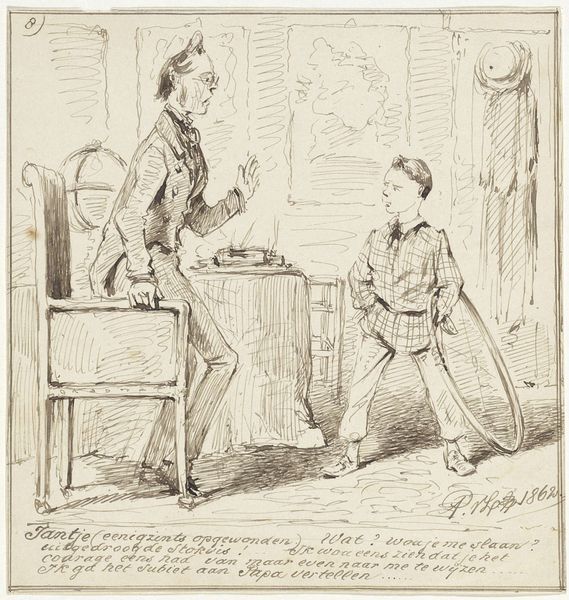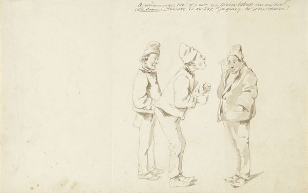 This print from 1830, by an anonymous artist, employs etching to convey a potent political message. The composition is structured around two figures, each delineated with stark, contrasting lines that define their forms and attitudes. The figure on the left, heavier in build and attire, holds a glass, while the figure on the right gestures emphatically, creating a visual tension that speaks to the discord of the time. The artist uses the starkness of the etching to highlight the figures against a minimal background, emphasizing their interaction and the immediate socio-political dynamic. This austerity challenges fixed meanings and engages with new ways of thinking about power. The linear precision, combined with the caricature-like portrayal, suggests a critical deconstruction of authority and social norms. This print not only captures a moment of political unrest but also serves as a commentary on the instability of power through its formal qualities.