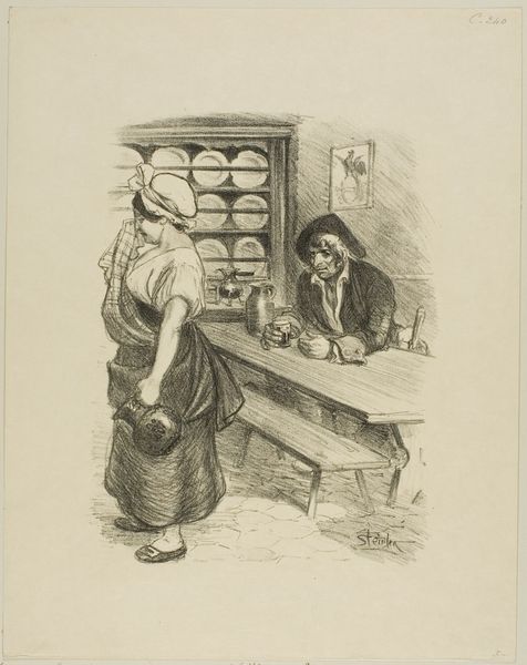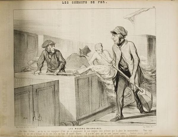 Editor: So, here we have Honoré Daumier's lithograph from 1843, "The Bath Tub Cars." It seems to be a humorous take on early train travel, but there's also a hint of social commentary, perhaps about class differences. What stands out to you in this piece? Curator: Daumier was a master of using satire to expose the inequalities of 19th-century France. This piece isn't just funny, it's deeply critical. We see the working class literally cleaning up after the discomfort of the bourgeoisie. The "bath tub cars" become a metaphor for the exploitation inherent in this new era of industrial transportation. How does the text accompanying the image shape your understanding of that social commentary? Editor: It suggests the travelers are complaining, despite getting a "bath" for a low price, further highlighting the disconnect. They even ignore the worker cleaning the tubs! Curator: Exactly! This is Daumier drawing attention to the ignored labour that made their journey possible. He invites us to consider who benefits from progress and at what cost. The casual cruelty in their dismissal of the worker reflects a larger systemic issue. Do you see any echoes of this dynamic in our contemporary society? Editor: I think so! It reminds me of delivery drivers during the pandemic, deemed essential yet often underpaid and overworked while catering to middle class consumer habits. Curator: Precisely! And thinking about this imagery within a contemporary lens, the bath tub is, perhaps, an intersectional commentary: who has access to leisurely bathing versus those for whom cleaning such a luxury is a part of their exploitation? Daumier compels us to confront uncomfortable truths about privilege and labour then, as it is reflected in our lives now. Editor: It’s incredible how a seemingly simple caricature can reveal such profound layers of meaning. Curator: Indeed. Daumier understood that art could be a powerful tool for social change, urging us to recognize and challenge inequalities within our own communities.