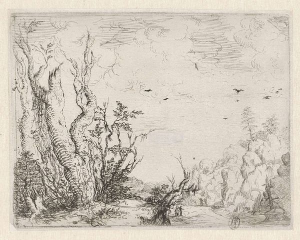 "Landschap met twee ezehoeders" ("Landscape with Two Donkey Herders") is an etching made by Jan van Ossenbeeck in the 17th century. During this period, the Dutch Golden Age, the Netherlands experienced significant economic prosperity and artistic innovation. It was also a time of stark social hierarchies and colonial expansion. This landscape, with its rustic figures, speaks to broader questions of labor and representation. Who are these anonymous figures, and what does it mean to depict them within a landscape? The donkeys they lead, burdened with goods, tell a story of work, while the landscape itself, though seemingly natural, carries the weight of human activity and economic exploitation. Rather than romanticizing rural life, this etching hints at the everyday realities of those whose labor supported the burgeoning Dutch economy. It’s a small scene, yet it opens up a much larger dialogue about the relationship between people, land, and power.