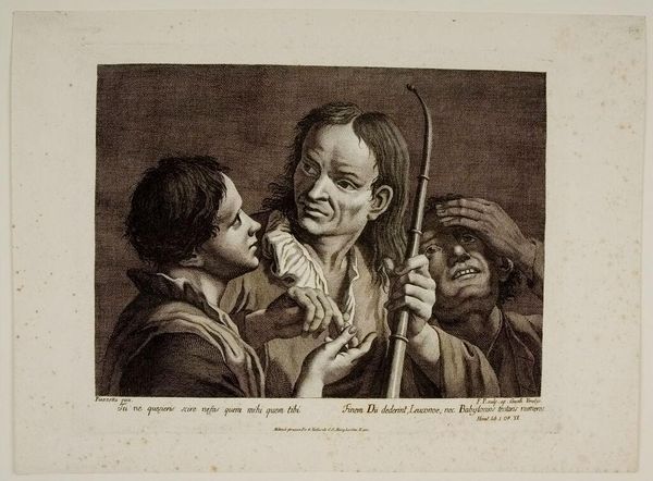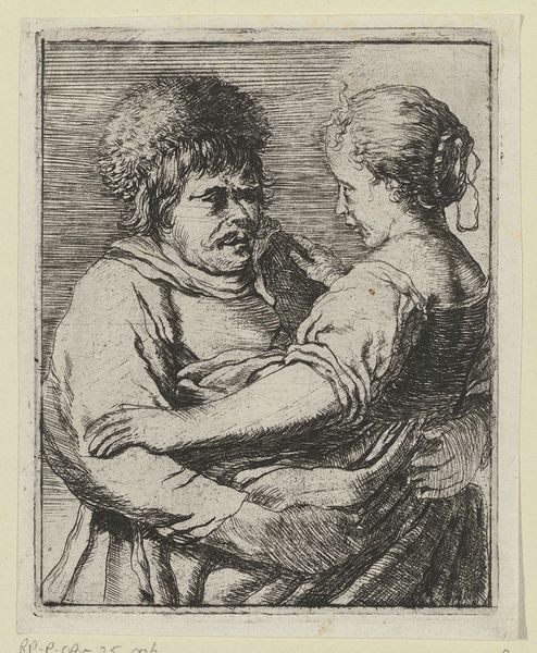 Editor: This is Giovanni Cattini's "Woman Telling Beads and Boy Counting Money." The etching seems to explore the relationship between labor, spirituality, and perhaps even social class. How does the materiality of the print itself influence our understanding? Curator: The print medium allowed for wider distribution, democratizing images of piety and labor. Consider the etching technique: the repetitive, skilled labor mirrors the actions depicted, and asks us to consider the value of repetitive tasks. Editor: That’s fascinating. So, the means of production comment on the subject matter? Curator: Precisely. What does the act of printing itself tell us about the accessibility and consumption of these themes in Cattini's time? Editor: I see a deeper connection between the artwork and the society it was created for. Thanks!