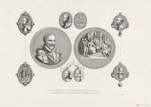 Dirk Jurriaan Sluyter created this monochrome lithograph of five portraits in medallions. The composition relies on a central medallion flanked by two pairs, creating a symmetrical yet dynamic arrangement. The ornate frames around each portrait lend a sense of classical formality. The artist employs the circular form to isolate each subject, emphasizing their individuality. The varying gazes and postures within the medallions add a layer of complexity, suggesting distinct personalities and roles. The formal wear of each man signifies their status, hinting at the social structures and hierarchies of the time. Sluyter’s choice of lithography allows for a precise rendering of detail, evident in the textures of clothing and facial features. These minute details are vital, functioning as signs that communicate the subjects' identities, their professions, and their place in society. In essence, this print captures not just individual likenesses but also the broader cultural codes that defined 19th-century Dutch society.