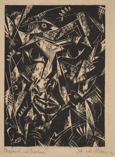 Curator: Here we have Peter Krasnow's "Mother and Child," a woodcut print from 1929. The stark black and white contrast is immediately striking, isn't it? Editor: Yes, I agree. The intense juxtaposition definitely grabs your attention. The angular forms give the image a powerful, almost unsettling quality, which clashes with the expected sentimentality of the subject. Curator: As a woodcut, the piece speaks volumes about process and the labor involved. Each line, each shape, painstakingly carved away to leave only the image behind. Krasnow, as a Jewish immigrant in Los Angeles, lived through immense economic and social upheaval during the depression era. Could this bold image explore his complex experience in that environment, the labor and craftsmanship reflected the broader struggles and realities of its time? Editor: That's compelling. However, before delving into socioeconomic factors, let's consider the visual relationships. The artist creates a structured interplay between the black and white areas which emphasizes certain aspects and de-emphasizes others. Note how the faces, particularly the mother’s profile, is constructed from planes of sharp lines; it's geometric almost like Cubism but with this rough-hewn texture. It's emotionally charged through form itself. Curator: Absolutely, and I see those stylistic elements deeply embedded within the conditions of its creation. The German Expressionist movement had its origins among craft guilds as artists looked to both folk-art, to counter academic aesthetics, but the black and white design considerations for posters also had its influences on movements to come. What meaning did craft have within the artist's society? Editor: Agreed; its construction clearly contributes to its visual meaning. Let us examine this compositional element – note the way the child is nestled against the mother, almost an extension of her. Then, there is an odd and intrusive triangular feature looming in the background; this stark geometric contrast of black and white evokes anxieties about vulnerability. Curator: I would suggest that the way in which mass production techniques made artwork affordable had meaning too – perhaps both to the artist, and patron, and to subsequent readings by academics, just like our readings today. Krasnow originally intended to be a tailor and one wonders how that shaped his understanding of artistic skill and the material processes available. Editor: A very stimulating discussion, that certainly enriches our viewing of "Mother and Child,". Thank you. Curator: Indeed. Reflecting on the materiality alongside cultural contexts really does highlight how interconnected everything is.