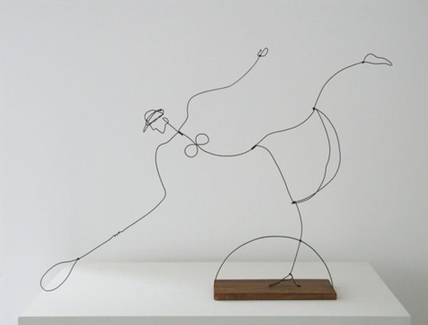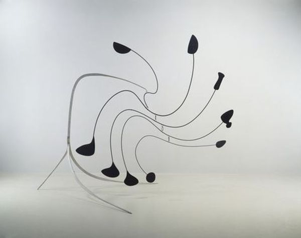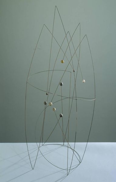 Editor: We're looking at Alexander Calder's "Four Leaves and Three Petals," created in 1939. It’s a striking mobile crafted from metal. It feels both playful and incredibly structured to me. What do you see in this piece? Curator: Immediately, I am struck by the dynamism inherent in its construction. Observe the delicate balance achieved through the careful distribution of weight and the linear articulation of form. Note how the geometric elements—the "leaves" and "petals"—are suspended, creating a visual dialogue between positive and negative space. The piece compels us to analyze its internal mechanics, the play of tension and equilibrium. Editor: It's interesting how you focus on the balance. I was thinking more about how it evokes a sense of nature. Is that something Calder was aiming for, or is it purely about the forms themselves? Curator: The question of intent is secondary to the artwork’s internal logic. The resemblance to organic forms is, perhaps, coincidental. Consider the arrangement of colours: primary hues appear as deliberate points of emphasis, punctuating the otherwise monochrome structure. It is within these formal relationships, not in representational aspirations, that the meaning resides. How does that affect your interpretation? Editor: That makes me think about the title. It guides us toward seeing "leaves" and "petals", but it may lead us astray from appreciating the structure itself. I wonder if Calder gave any hints for interpretations other than botanical. Curator: Titles are frequently misleading, sometimes ironically so. To unlock its value, one has to rely on semiotics and formalism, viewing this piece as a study in form and material and internal arrangement rather than descriptive realism. Editor: That's a really interesting way to look at it. I came in thinking about nature, but now I see how important the structural composition is. Curator: Exactly, moving forward always analyse first what you can objectively deduce based on formal choices.