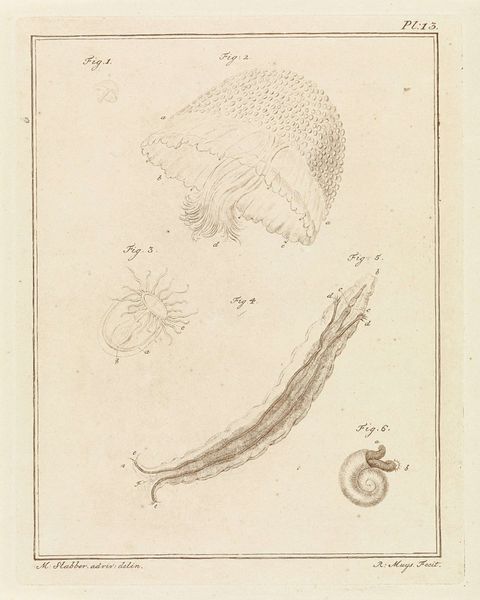 Editor: So, we’re looking at "Verschillende zeedieren," or "Different Sea Creatures," created in 1778 by Robbert Muys. It's a print that combines aquatint, engraving, and ink on paper. I’m struck by its scientific and almost clinical style. It feels like a page out of a biology textbook. What jumps out to you about this piece? Curator: It's precisely that "scientific" quality that interests me. Consider the means of production: engraving and aquatint were crucial for disseminating knowledge and controlling visual information in the 18th century. This wasn't simply an aesthetic choice; it reflects the values placed on accuracy, objectivity, and standardization inherent in the era's developing scientific practices. How do you think the choice of these printmaking methods affects our understanding of the natural world? Editor: That's a really interesting way to frame it. I hadn't thought about the printmaking process itself contributing to a specific worldview. I suppose it does lend a certain authority. Curator: Exactly! And notice how the print meticulously catalogues the different sea creatures. This relates to how classification was crucial at this time, and tied to colonial resource extraction and domination. By fixing these ephemeral creatures into print, Muys, enabled this act of knowledge as power. Consider also, the labour involved in creating the detailed plates – that’s part of its meaning. Do you see the plate number? How might that influence its interpretation? Editor: I see it – "Pl. 13." It positions it within a larger collection or scientific text, doesn't it? Implying, as you said, control of information… It’s not just an individual artwork; it's part of a system. I will certainly not overlook process again. Thank you for sharing a new perspective! Curator: My pleasure! Recognizing the labor, materiality, and purpose of production changes how we view art. It ceases to be just a picture and becomes an object deeply enmeshed within its time.