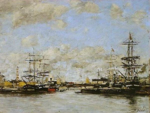 Eugène Boudin's "Le Havre. Barre Basin." captures a dockside scene with a masterful arrangement of form and light. Boudin skillfully utilizes a muted palette of blues, grays, and browns, creating a tranquil yet evocative atmosphere. Horizontally oriented, the composition emphasizes the flatness of the picture plane. Boudin layers space by arranging ships and buildings along the horizon line, and by blurring the distinction between water and sky through subtle tonal variations. The brushwork is loose and gestural, with visible strokes that add a sense of movement and immediacy. Boudin disrupts traditional perspective by flattening the spatial recession, which aligns him with a broader avant-garde tendency to challenge academic conventions. Ultimately, Boudin's work can be seen as a prelude to impressionism, emphasizing surface and texture over illusionistic depth, and paving the way for future re-evaluations of what painting could be.