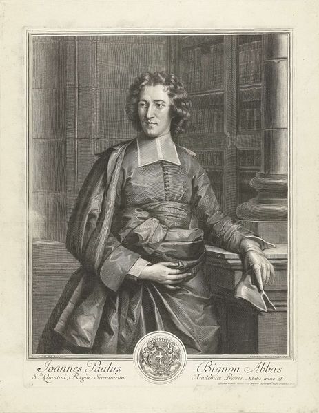 Editor: Here we have Jacques Nicolas Tardieu's engraving of Bon de Boullongne. I'm struck by the use of line to create texture and form. What stands out to you in its composition? Curator: The oval frame is key. It isolates the figure, directing our focus to the interplay of light and shadow on Boullongne's face and attire. Note the symbolic tools of his trade—palette and brushes—held with a delicate precision. The lines vary from light etching to deep scoring. How does this range affect your perception? Editor: It gives the image depth and tonal variation, almost like a painting in monochrome. I hadn't considered the oval frame to be integral to its structure. Curator: Indeed. By understanding the relationship between line, form, and frame, we gain a richer appreciation for Tardieu's skill.