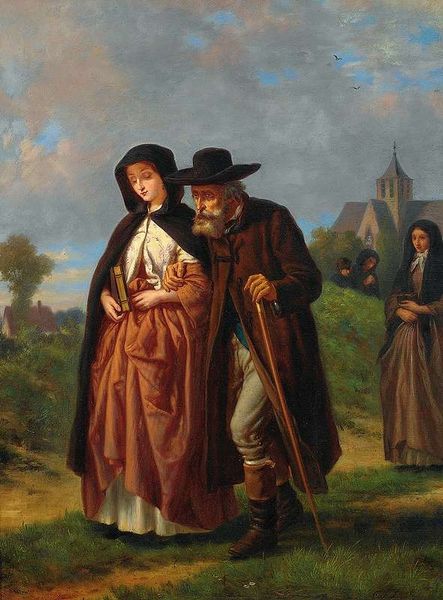 Curator: Welcome. Before us hangs Carl Bloch's oil painting, "The Reading of the Hand," completed in 1865. Editor: It immediately strikes me as a tableau of quiet tension. The light and shadow play so dramatically across the figures and stone, lending it a rather staged, theatrical feel. Curator: The artist was known for meticulous attention to detail. Bloch employs traditional methods of oil painting in rendering this work. Notice how the costumes speak of specific roles within the social fabric. Editor: Costumes, yes, but let's delve into what these figures *represent*. She, with her white head covering and modest gown – is she innocence, or perhaps suppressed longing? He, adorned with the musician's cap – is he a traveler, a tempter, a herald of destiny? The act of palm reading itself is thick with meaning! Curator: Right, this transaction represents labor: the labor of prediction, of attempting to read fate itself through tactile engagement. The materials themselves are humble – paint applied to canvas to perpetuate these social narratives and material conditions of everyday interactions and folklore. Editor: I find myself drawn to the implied narrative. The positioning of hands, her hesitant posture...palmistry speaks to this enduring human desire to glimpse the unknowable future and how people interact within cultural rituals that help express identity and create meaning. Curator: Think about the artist's own process: the mixing of pigments, the application to the weave of the canvas, building up layers. His choice of setting contributes as well—is it the crumbling stone entrance that helps create a stark juxtaposition between modernity and history? Editor: Absolutely, these motifs invite the viewer to construct a tale, pondering the choices before this young woman, the promises—or warnings—delivered through touch and tradition, or perhaps this gesture highlights feminine representation? Curator: Indeed, and to conclude, examining “The Reading of the Hand” we not only appreciate a romantic portrayal but also understand Bloch's careful craft and commentary on labour and the very material nature of storytelling. Editor: Agreed, in viewing "The Reading of the Hand" it prompts thoughts on timeless symbolic meanings, the role of gesture, and the powerful allure of narrative, prompting endless questions about who we are, what influences us, and what lies ahead.
