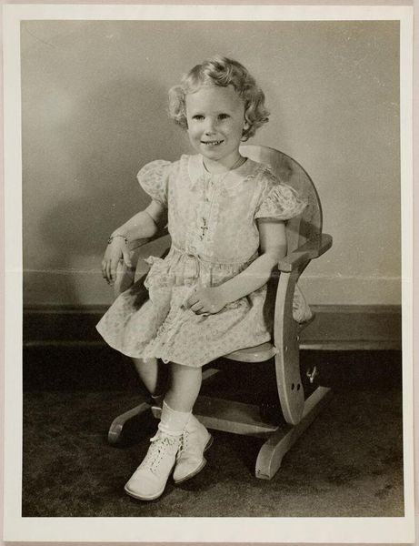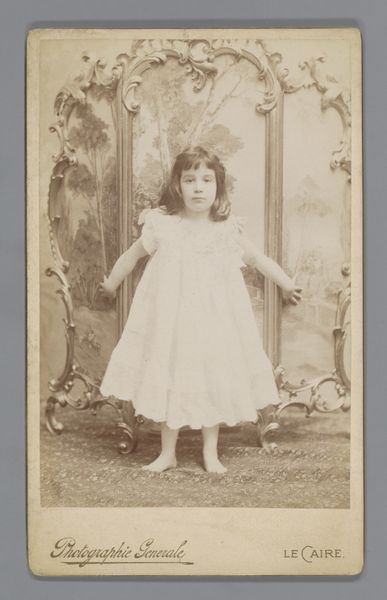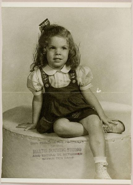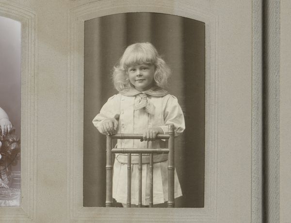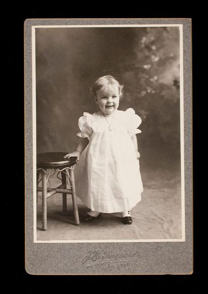 Curator: This is an untitled studio portrait by Martin Schweig, currently held at the Harvard Art Museums. It depicts a young girl in a frilly white dress. Editor: My first impression is one of innocence. The stark white dress, the girl's direct gaze, it all feels very staged, yet strangely touching. Curator: Studio portraits like this served a vital social function. They captured a moment in time, solidifying family history. Note the "proof" text, indicating its place in the photographer's process. Editor: Yes, and the white dress, reminiscent of a christening gown or even a wedding dress, carries powerful symbolic weight. It speaks of purity, new beginnings, and societal expectations for young women. Curator: Indeed. The image is a powerful commentary on the role of photography in constructing and perpetuating cultural ideals. Editor: It also feels like a poignant reminder of childhood's fleeting nature, captured through these carefully curated symbols.