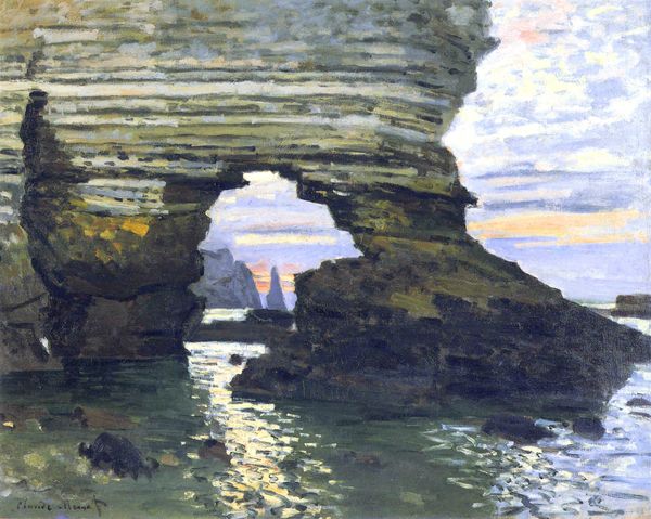 Curator: Monet's "The Manneport, Rock Arch West of Etretat," painted in 1883, immediately strikes me with its bold, almost tactile quality. Editor: Yes, it does possess an immediacy. The chromatic intensity and visible brushstrokes create a sense of raw energy, especially around the tumultuous water. How do you interpret the overall composition? Curator: The massive arch dominates the canvas, framed just off-center, which lends the piece a dynamic tension. It’s not merely representational; it’s an investigation of light, color, and form, meticulously applied. Editor: Absolutely, but this coastal scene at Etretat held profound significance within the French cultural landscape, acting as a key point of artistic gathering and reflection. Think of its allure as a symbol of national identity amidst the anxieties of a changing world. Curator: You are absolutely correct. We must also examine Monet's systematic use of color, using individual strokes to describe, rather than depict literally. The contrast between blues, greens, and ochres constructs a sensory experience above merely creating a visual scene. Editor: True. And we can't ignore the socio-economic factors that influenced Monet. This was an era grappling with industrialization. The rugged, unspoiled beauty of the coastline presented a kind of sublime escape from the pressures of modernity, which found a ready market in Parisian buyers. Curator: Precisely. His approach revolutionized landscape painting, transitioning it from topographical documentation to an experience. Monet isn't merely showing us Etretat; he's conveying his perception of the location through visual semantics. Editor: Viewing “The Manneport, Rock Arch West of Etretat” it becomes obvious that this seascape offered a painterly escape that mirrors the social longing for a simpler time. Curator: In analyzing his technical genius alongside the painting’s historical relevance, a great art piece begins to form.