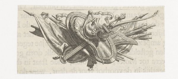 Editor: This is Thomas Stothard’s “Trophy of Turkish and Other Arms. Design for a Tailpiece,” created sometime in the late 18th or early 19th century. It’s a small, delicate sketch, mostly in grey tones, of, well, a trophy of arms. What strikes me is how almost playful it feels, despite the serious subject matter. What do you see in it? Curator: Playful is interesting… It makes me think about Stothard, lost in his own creative world, surrounded by books and sketches. Imagine him conjuring up images of faraway battles and exotic weaponry, but filtered through his own delightful imagination. The weaponry isn't threatening, per se, but rather invites you on a journey. What do you make of that? Editor: I see what you mean. It's less about the violence of war and more about the *idea* of it, filtered through Stothard’s imagination. Thanks, that gives me a whole new way to look at it! Curator: Precisely! And isn't that the most enchanting thing about art? It's never quite what it seems, is it? Always whispering secrets to those who listen closely.