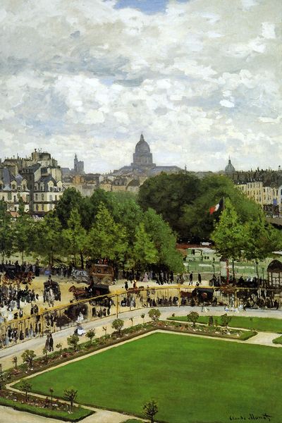 Editor: Here we have Claude Monet's "Wharf of Louvre, Paris" from 1867, rendered in oil paint. There's a distinct hustle and bustle to this scene, a real energy. What strikes me most is how many people are depicted, what can you tell me about it? Curator: Well, look closely at the composition; see how Monet meticulously applied paint to depict not only the architecture but the very fabric of Parisian life. The raw materials – the pigments ground to create the paints, the canvas itself – are deployed to represent the city's burgeoning commercialism, its endless transactions and movements. How might the industrial revolution be reflected in even such seemingly placid elements as the figures' costumes, or the horses pulling carriages? Editor: I hadn't considered the materials used in their clothes and carriages. You mean how industrial processes allowed for mass production, impacting what people wore and how they moved around? Curator: Precisely. The very leisure depicted here becomes a product of those social and industrial shifts. It is worth thinking about how labor shaped Monet's practice and how he would be part of a shift towards art becoming less explicitly ‘useful’. Can we see in the very application of the paint itself, a rapid and deliberate act, a metaphor for this new pace of life? Editor: That's a compelling perspective. Seeing it as a reflection of broader social changes through the materials depicted is quite insightful. Thank you. Curator: My pleasure. Understanding the historical context surrounding the making and materials gives a fuller appreciation for the artwork, going beyond aesthetic value alone.