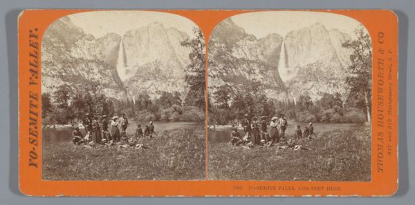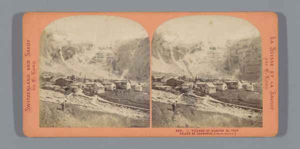 Curator: What strikes me about this image is the almost theatrical staging of nature, quite typical for the romantic period. Editor: Yes, it certainly has a performative element. This is a stereoscopic gelatin silver print, titled "Gezicht op een dal nabij Chamonix" or "View of a Valley Near Chamonix" by Ernest Eléonor Pierre Lamy, dating from about 1860 to 1880. Stereoscopic images like this were very popular; they created an illusion of depth. Curator: And the composition underscores that constructed perspective. We have these clearly defined planes – the foreground with a solitary figure, the middle ground with modest buildings, and then this dramatic backdrop of the imposing, almost oppressive mountain. The power dynamics are palpable! Editor: Precisely! This speaks directly to the socio-political climate of the time. These images were consumed by a burgeoning middle class, eager for accessible vistas of power and natural beauty. Tourism, enabled by the emerging railroad system, fueled demand for images reinforcing these sublime views, cementing a sense of national identity and colonial dominance over the natural world. Curator: So the viewer gets a pre-packaged experience of nature, confirming their place in a social order. It makes me consider questions of access and the very construction of landscape. The romantic gaze becomes a colonizing gaze. What about the individual barely visible in the foreground? They look rather anonymous and dwarfed. Editor: A crucial point. In that moment, are they just a token, serving the larger symbolic drama? The lack of agency highlights the control that institutions exerted upon both individuals and natural resources, offering us today important lessons concerning equity and the power dynamics that influence perceptions of value. Curator: Thinking about art as part of these larger power narratives, its influence can’t be denied. This photograph provides just such a portal into thinking critically about the complex relationship of art, nature, and power. Editor: And the continued need to scrutinize how those relationships shape our perceptions still today.