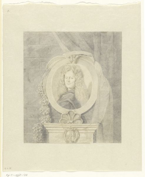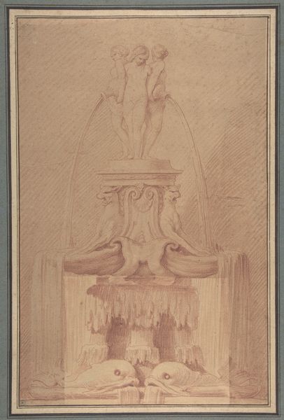 Curator: Let’s turn our attention to this engraving entitled "Vaasvormige Fontein," or Vase-Shaped Fountain, made between 1729 and 1737. It’s currently held here at the Rijksmuseum. The artist was Gabriel Huquier after F.D. Bouchardon. Editor: It immediately strikes me as a bit grotesque, in an almost charming way. The squatting figure at the top especially. It gives the piece an odd, animated feel despite the static medium. Curator: The baroque loved these dramatic contrasts. The figure you're referring to, perched atop the fountain, speaks to the era’s fascination with the mythical and the theatrical. Remember that prints like these allowed the latest fashions in garden design to circulate widely among the aristocracy. Editor: Yes, but that squatting figure looks like some ancient forest deity…or perhaps even a Silenus, a companion of Dionysus. There is a bestial quality about him with an implicit connection to primal forces. Water, fertility...life. What’s particularly interesting is the face contorted as though it is yelling to no avail! Curator: Interesting observation! Water features were vital demonstrations of wealth and technological prowess within the noble parks and gardens. Fountains signaled dominance over nature. The imagery often underscored the patron's power, echoing classical themes to legitimize their position. The 'Privilege du Roy', indicated on the engraving here, essentially provided the artist with copyright protection granted by the king. Editor: I'm drawn to the faces embedded in the fountain's base. Are those satyrs? Are they further expressions of this Dionysian energy, echoing through water, stone, and our peculiar forest figure? It’s as if the fountain itself is a living entity. It appears in a liminal state between organicism and classicism Curator: The artist employs hatching and cross-hatching to render texture, bringing depth to a static work and emphasizing its ornamental complexity. These weren't merely representations of sculptures; they were tools of aspiration and dissemination. It's the eighteenth-century version of an architectural digest! Editor: Yes. Seeing how symbols can carry meaning over such expanses of time always fascinates me! That sense of memory, distilled through such forms. Thank you. Curator: Indeed. Understanding these visual emblems grants us insights into a long and fascinating discourse concerning taste and social order.