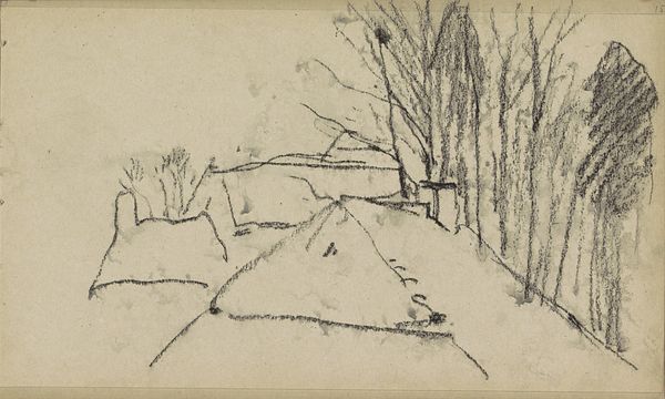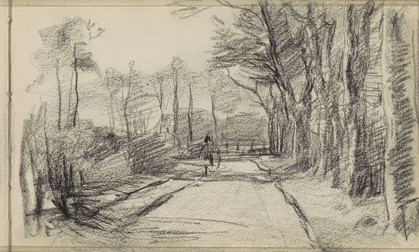 Curator: This is Anton Mauve's "Landweg met een figuur op een kar," a pencil drawing from somewhere between 1848 and 1888. It's currently held here at the Rijksmuseum. What's your immediate take? Editor: Bleak, but beautiful. It feels like winter closing in, doesn't it? That solitary figure on the cart… makes you wonder about their journey, where they’re going. The sketchiness, the simplicity... it almost invites you to fill in the blanks, to complete the story. Curator: Precisely. Mauve's economy of line is remarkable here. Consider the social context; this work reflects the realities of rural life and transportation of the time. The means of depicting that reality is reduced to its essential strokes. He transforms labor into visual poetry. Editor: I see what you mean, there’s something very down-to-earth, tangible about it, but that lone figure against the vast landscape gets to me. I imagine myself there, wrapped up in scarves, the air biting. Makes you appreciate things like a warm fireplace! I get lost imagining that road and wonder, you know? Did he meet Vincent that day? Curator: Vincent van Gogh, Mauve's cousin-in-law, indeed was influenced by his landscape work. And regarding the tangible, this simple pencil on paper documents not only the scene, but the labor inherent in its rendering and what would’ve also been present in the reality of those figures during those harsh seasons. Editor: Definitely a romanticized version of harsh, wouldn't you say? Even though the sky’s muted, there’s light hinting through the branches. And you're right—seeing the sketch gives it a 'realness,' makes you aware of the human effort, which is so powerful, adding to its appeal beyond a snapshot. It feels like a glimpse of a fading era, viewed through very romantic lens, or is that just me? Curator: There is, of course, the appeal to romanticism, or what persists in impressionism. What materials afford to a scene always contributes something additional. Editor: Thinking about the bleakness before—now seeing the bare branches, they almost dance, right? As though this bleakness also has beauty in it if one can slow down to feel that dance. The world, after all, is what you make of it, literally, for the laborer, and visually for us gazing upon it. Curator: Yes, and this invites considering all aspects of this visual and cultural labor together. Editor: Makes you look at the landscape around you anew, doesn’t it?