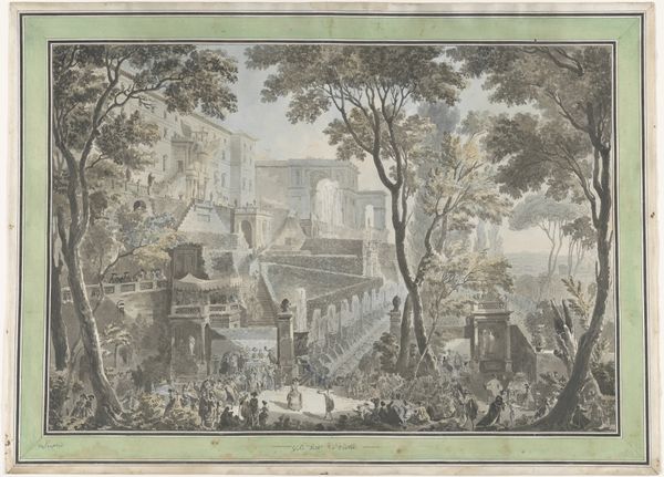 Curator: So, here we have David Vinckboons’ "Venetian Party in a Chateau Garden," dating back to around 1602. It’s rendered in ink. Editor: The first impression I get is of organised chaos—the eye leaps from group to group. It feels expansive yet contained. The monochrome palette gives it a dreamlike quality, like a memory viewed through time. Curator: It’s fascinating how Vinckboons situates these fashionable figures in a public garden, potentially drawing from accounts of aristocratic life but also speaking to the evolving social dynamics of the period. Public spaces were increasingly sites for demonstrations of power and wealth. What is conveyed here through the abundance of people? Editor: There's an interesting contrast between the meticulously detailed background and the almost abstracted treatment of the figures. Look at the play of light and shadow within the foliage of the trees; each leaf seems individually rendered. Then observe how the human forms are gestural suggestions of bodies and clothing, rather than detailed portraits. Does that abstraction help serve his purpose? Curator: Absolutely. It pushes us to consider the work not just as a scene but as a statement about performance and the social gaze. The garden acts as a stage, each figure playing their assigned part within a specific, power-laden system. And the material limitations actually make it a richer resource of cultural understanding. How do we contextualise displays of status across cultures? How are social expectations expressed in shared leisure spaces today? Editor: I find the scale particularly compelling. He manages to create a sense of depth, but through line and pattern rather than aerial perspective. My mind follows each line of the structures depicted into the distance in fascination. The eye travels and is consistently rewarded. This, as you state, turns into an impactful display. Curator: Exactly. Understanding the context alongside technique gives it weight, particularly given how contemporary political ideas of display remain potent. Editor: It certainly underscores how visual analysis enhances historical depth. I leave with a renewed understanding of just how the intrinsic, formal decisions influence cultural storytelling and discourse. Curator: Agreed. It shows how closely observing lines and forms, placed inside social considerations, can really lead us to consider how public art functions as propaganda and record.