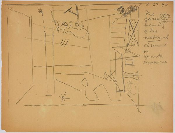 Curator: Attilio Salemme’s “Magic Mouse,” created in 1950, employs graphic art techniques in monochrome. It is rather whimsical at first glance. Editor: Yes, immediately it reads to me as an invocation of folklore and the symbolic realm, something between a child's dream and a ritual space. The mouse, centered in the composition, adopts a meditative pose. It feels like he’s the nucleus of some hidden power. Curator: Salemme, an Italian-American artist, often explored themes of displacement and identity within his work, and I find it hard to resist interpreting this scene through the lens of immigrant experience. Editor: Ah, tell me more. I can see it; I was drawn in by the universality of visual symbols here, especially the star. I see here the connection to hope and navigation, a longing for something beyond our immediate surroundings. Curator: Exactly! This scene feels intensely private and perhaps represents the "magic" of cultural retention or perhaps the conjuring of a new hybrid identity. The figure exists between worlds, represented by what seem to be doors or portals to some unknown. Editor: Interesting. I’m particularly drawn to the altar-like table bearing what appears to be a six-pointed star. The number of sides adds to the notion that something is out of alignment, the image creates such tension with this tiny tweak of a common symbol. This symbol contrasts, though, with the single star hanging above—guiding light. There is much here to be worked through and untangled in this intimate scene! Curator: And look at how Salemme deliberately uses negative space. The white outlines that define the mouse and the surrounding objects pop from the darker ground and create a unique dialogue of presence and absence within the frame. It speaks to ideas about self-representation and being seen, and unseen. Editor: The rough hewn aesthetic certainly reinforces that duality—as well as creating the sense of raw emotion—do you think this emotional honesty relates to the time? Is there something postwar at play? Curator: Absolutely. The post-war era in the United States, which had become his country of immigration, was riddled with complexities for those who were new arrivals. It was a time of both great opportunity and of social unease. Editor: Understanding that context really does alter my reading, I’m glad we were able to think about it with an intersectional, and socio-historical lens! I feel more familiar now with what the piece has to offer. Curator: Absolutely, by acknowledging the multi-layered, personal and cultural background from which the work comes, Salemme’s intimate moment is so enriched.
