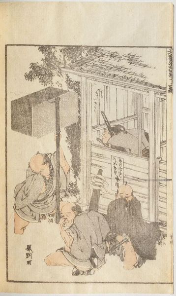 Editor: This is Hokusai's manga, volume 12. The figures seem to be in distress, perhaps even despair. There's a figure behind bars with a sword. What do you see in this image? Curator: Consider the symbolism. The bound figures juxtapose with the sword, which often represents authority and power. Do you notice how this visual tension speaks to the cultural memory of justice, punishment, and societal hierarchies? Editor: I didn't make that connection, but I can see how the imagery holds a lot of cultural weight. Curator: Indeed. The weight of those symbols, the contrast between confinement and power, invites us to contemplate the continuity of these themes throughout history. Editor: It’s fascinating to consider the depth of cultural meaning embedded in what seems like a simple sketch.
