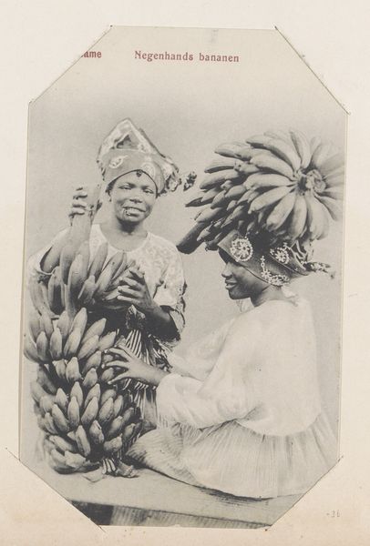 Eugen Klein made this photograph, Zittende vrouw met bananen, using photographic techniques that were emerging in the late 19th and early 20th century. The image shows a woman with a large bundle of bananas on her head, and another at her side, presumably for sale. The photograph, itself a reproducible medium, captures a moment of labor and commerce. The bananas are the key element, representing both sustenance and a commodity, and they have a powerful presence. This piece encourages us to consider the labor involved in the production and distribution of goods, and the economic structures that shape people's lives. Klein's photograph underscores the relationship between art, labor, and the global economy. It challenges traditional notions of what constitutes 'high art' by drawing attention to the everyday realities of work and trade. It reminds us that the value and meaning of objects are deeply intertwined with the social and economic contexts in which they are produced and consumed.