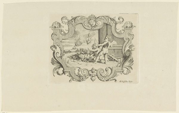 Abraham Delfos made this delicate etching, Allegory on Peace with Three Putti in Cartouche, in the 18th century. Etching is an intaglio printmaking technique, where a metal plate, traditionally copper, is coated with a waxy, acid-resistant substance called a ground. The artist then scratches an image into the ground, exposing the metal. The plate is immersed in acid, which bites into the exposed lines, creating grooves. The ground is removed, ink is applied to the plate, filling the etched lines, and the surface is wiped clean. Finally, the plate is pressed onto paper, transferring the ink and creating the print. The image's fine lines and subtle tonal variations display Delfos's skill, reflecting the labor involved in preparing the plate, etching the design, and printing the image. It’s a process that involves expertise, time, and physical effort, contrasting with today’s digital image production. Thinking about the work and the cultural and social context in which it was made reminds us that printmaking was an essential means of communication and artistic expression, long before photography and digital media.