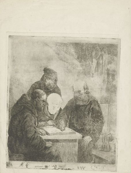 Curator: Alfred Ronner's 1893 drawing, titled "Vergrooten," presents us with an intimate scene rendered in graphite. Editor: Immediately, I’m struck by the texture – that intense hatching gives such weight to the figures and their surroundings. It’s almost claustrophobic, but the light source draws you in. Curator: Indeed. Notice how Ronner uses dense lines to depict the craftsman’s worn apron and the rough wooden table. It tells us so much about his daily life and the realities of his labor. The contrast between these elements and the girl’s plain clothing emphasizes a social dynamic, too. What do you think the symbolism suggests about their connection? Editor: The figures have a definite weight – and her form certainly has connotations, being younger, and also carrying that small bag to the figure we recognize as an older, working man. I can also detect motifs around caregiving – note that the shoemaker sits, but seems tired nonetheless as he completes the physical craft that clearly occupies his place in society. And the humble surroundings, they underscore a common human interaction - this girl might be someone taking him alms, but he is also very possibly her relative. Curator: Considering the period, such an exchange could point to shifting economic structures impacting families and skilled trades. We observe this material culture reflected in the subject and in Ronner's deliberate rendering of the workspace. A stark view on artisanship in the face of nascent industrialism, no? Editor: I see something else too, which could reflect both this man's labour, and the humble generosity in return - notice the small, very realistic form of an animal or dog figure sitting right near the ground? It looks poised at their feet, in fact. And could be meant to signal faith. Curator: Interesting reading! It does serve as a grounded counterpart, situated as it is. But my gaze is pulled by the economic narrative, that seems to bind the room with visible traces of labor. It seems likely to be read from how Ronner highlights tools, materials, even shadows on the walls. Editor: Well, art always has a touch of both symbol and situation... Curator: True. Looking closer, there’s much to admire in his commitment to documenting tangible existence. Editor: And finding the quiet dramas within.