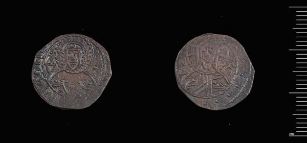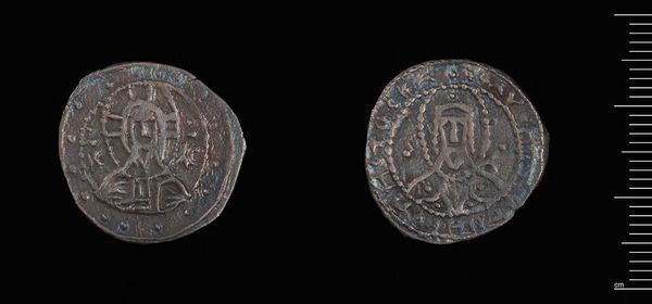 Editor: This is a Half-Stavraton of Manuel II. It's hard to get a sense of it on the screen, but the dimensions tell us it is quite small. The condition makes it hard to determine the material and the images are of variable quality. What strikes me most is the geometric abstraction of the figures depicted. How do you interpret this work? Curator: Indeed, the simplification of form, coupled with the circular format, immediately recalls Byzantine aesthetics. Notice how the incised lines define volume and texture. It is a clear attempt to reconcile symbolic representation with the physical constraints of the medium. Editor: So, the material limitations drove the aesthetic choices? Curator: Precisely. The artist, constrained by size and material, uses line and form to convey power and divinity. The coin's circularity is not merely a shape but an intentional enclosure, framing these concepts. Editor: I never considered the circle itself as part of the meaning. Thanks for that insight. Curator: My pleasure. Looking closely, we can observe a sophisticated negotiation between artistic intent and material reality.