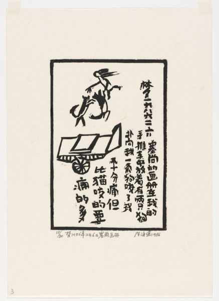 Editor: Chen Haiyan's woodblock print, "None of the Melons Are Ripe," from 1986, has a striking, almost melancholic feel despite its simple composition. What do you make of the socio-political context of this piece? Curator: Well, consider the year. 1986 was a time of significant reform and opening up in China. Could this image, with its "unripe melons," be a subtle commentary on unfulfilled promises or anxieties about the pace of change, perhaps reflecting public sentiment? Editor: That's fascinating. The starkness of the print definitely lends itself to that interpretation. I hadn't considered it that way. Curator: The limited color palette and the almost childlike quality of the drawing also raise questions about artistic freedom and expression at the time. It invites us to think about the relationship between art and propaganda, as well as the role of the artist in society. Editor: It's incredible how much historical context shapes the way we perceive even seemingly simple artworks. Thanks, I'll definitely carry this insight as I study more artworks.