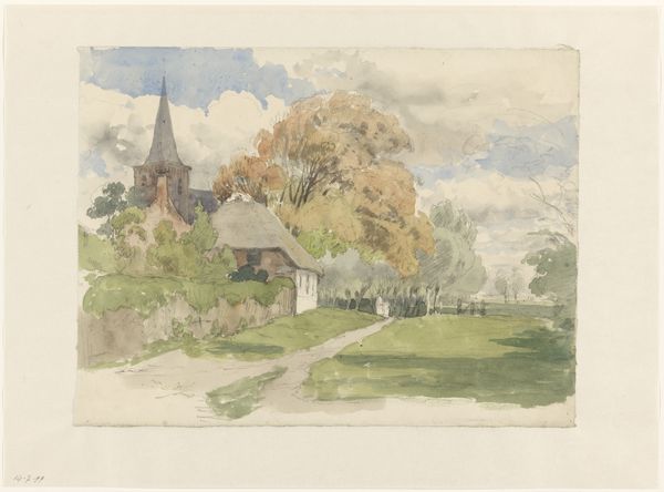 Joakim Skovgaard made this watercolor and pencil drawing of Ejsing Church in Denmark. Watercolors allow for the layering of translucent washes, giving the artwork a soft, luminous quality. Skovgaard skillfully uses the medium to capture the subtle nuances of light and shadow on the church's facade, and on the surrounding landscape. The pencil under-drawing provides a structural framework, lending precision to the architectural details. It’s worth considering the social context here. Skovgaard was deeply committed to religious art, and his meticulous approach to his craft reflects a reverence for his subject matter. The choice of watercolor, a portable and accessible medium, suggests an interest in capturing the scene directly from life, on location. This brings an intimate, personal dimension to the depiction, and invites us to contemplate the intersection of faith, landscape, and artistic expression. It blurs the boundary between the fine arts and a kind of devotional practice.