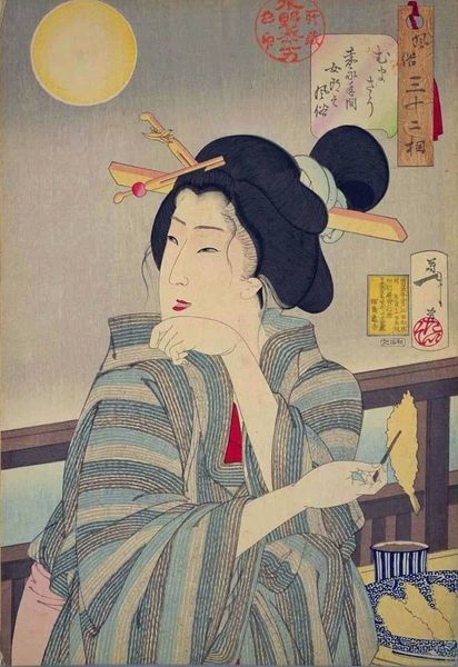 Tsukioka Yoshitoshi created this woodblock print during the Ansei Era. The process begins with a drawing, then a carver meticulously etches the image onto cherry wood blocks, one for each color. You can see the flat, graphic style that's characteristic of this demanding process. Consider how the lines define form and the subtle gradations of color create depth, particularly in the woman's kimono. Woodblock printing was not just a technique but a whole social system, involving artists, block cutters, printers, and publishers. The print’s success depended on their collaborative labor. These prints were commercial objects, reflecting the tastes and trends of their time, like fashion. Yoshitoshi elevated the medium through his draftsmanship and eye for capturing modern life. By appreciating the materials, labor, and social context behind this print, we gain a deeper understanding of its artistic and cultural significance. This challenges the traditional separation of craft from the so-called “high arts”.