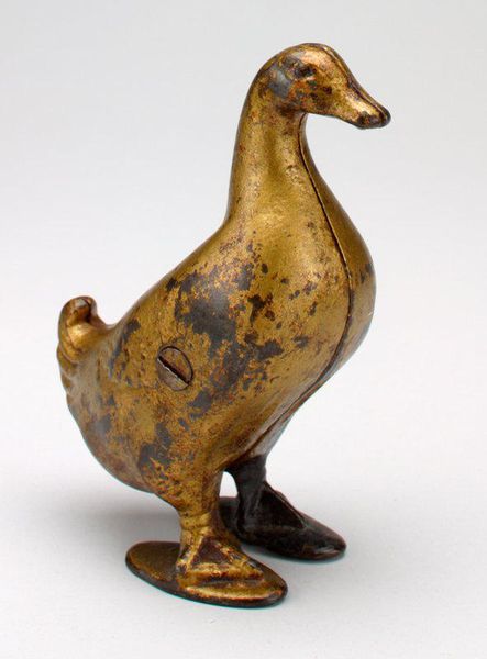 Curator: Standing before us is "And," a bronze sculpture dating back to 1900, crafted by François Pompon. It's currently housed at the SMK, the Statens Museum for Kunst. Editor: I must say, my initial impression is one of profound serenity. The smooth, almost seamless surfaces and rounded form exude tranquility. It's a duck distilled to its most essential essence. Curator: That's a beautiful observation. Pompon was indeed known for simplifying animal forms to capture their inherent character. "And" embodies this principle perfectly. He reduces the duck to almost geometric perfection. Editor: The brilliance is the elimination of distracting details. This isn't a photographic likeness. Pompon invites us to contemplate the pure idea of “duckness”. Is that a word? I’m making it one. Curator: Indeed. His choice of bronze contributes to the timeless quality of the sculpture. Bronze as a material lends itself to permanence, contrasting perhaps the fleeting presence of a duck in nature. The medium elevates what may have been once common into the status of art, a symbol, you know? Editor: I’m noticing now how light plays on the bronze. It’s more like gently embracing than sharply reflecting. The light amplifies the form. And it calls attention to all of the small tonal transitions in ways that really brings out all its curves. It seems a little magical somehow. Curator: Pompon, although working in the late 19th and early 20th centuries, anticipated many modernist ideals. It speaks to the way museums construct notions of ‘modern’ versus ‘traditional’– a sculpture like this destabilizes those neat boxes. Editor: That tension is compelling, because even in its smoothed and rounded shape it carries, maybe unintentionally, a memory of the natural form. And the title, “And,” it begs the question: And what else? What else is there to the experience of beholding this form? Curator: "And" reminds us to look deeper, and perhaps challenge the rigid classifications imposed upon art. It occupies an interesting place in art history. Editor: Ultimately, it's the sculpture's quiet strength that resonates most. In a world of noise and fury, there's an enduring appeal to such elegance and simplicity. I really think so, anyway.