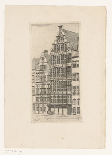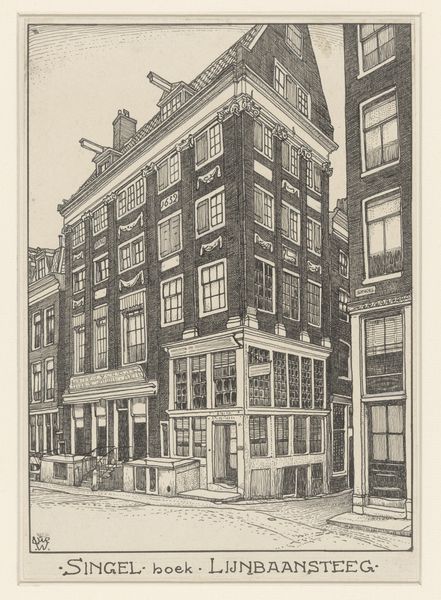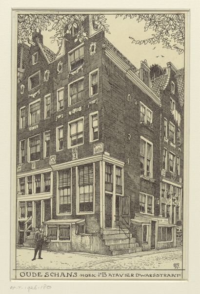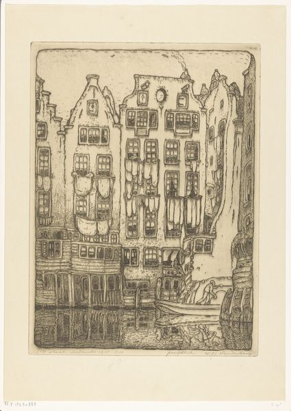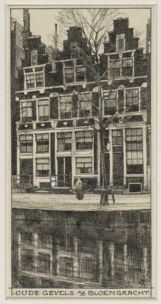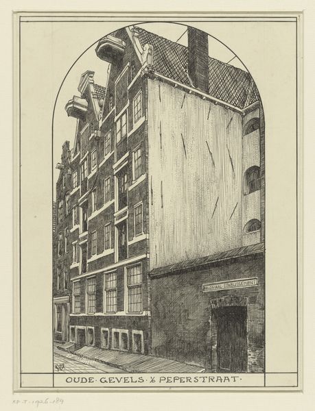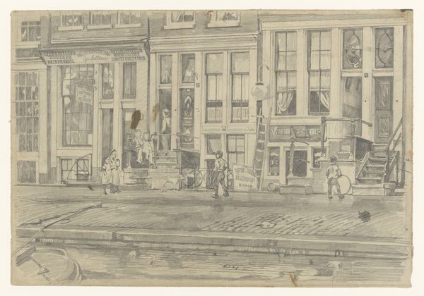 Editor: Here we have Willem Wenckebach's "Oude gevels aan de Prins Hendrik Kade te Amsterdam," a drawing done in ink between 1870 and 1926. The architectural detail is incredible! What strikes me is how the buildings seem to loom, overshadowing the figures in the street. What stands out to you in this piece? Curator: The artist's choice of ink as the primary medium emphasizes the material reality of urban development during this period. The etching process allowed for mass production, suggesting a democratization of art, bringing cityscapes to a broader audience through prints and reproductions. Editor: So you're focusing on how the piece was made rather than just what it depicts? Curator: Exactly. Look at the depiction of everyday life. The barrels, the people – these are products of a specific social and economic structure. The drawing isn't just a neutral observation; it's a record of labor, consumption, and urban infrastructure. Consider the labor involved in the trades and commerce displayed by each building facade. Editor: That's interesting; I was focused on the artistry and mood. Now I see it almost as a visual inventory of the city’s industry! It really places emphasis on the conditions of its production and the consumption of those products within a complex economic system. Curator: Precisely. It encourages us to move beyond just aesthetics and really look into what makes urban spaces – what systems and hands they’re created by. Editor: Well, I'll definitely look at cityscapes with new eyes from now on. It highlights how closely intertwined art, production, and social life truly are. Thanks!