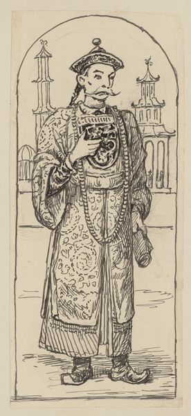 This print features a standing man with a turban and an instrument in his hand. The lines, though simple, meticulously define the figure's attire and the contours of his form. Consider the artist’s rendering of fabric; notice how they’re suggesting texture and volume through parallel and cross-hatched lines. The stark contrast between the hatched areas and the blank paper creates a play of light and shadow, lending depth to the figure. The artist’s focus is not just on representation but also on the materiality of the print itself. This work functions as a sign, embodying cultural codes related to dress and musicality. These signs are not fixed but fluid, open to reinterpretation depending on the viewer's perspective and cultural context. The print invites us to explore the semiotics of dress, music, and identity, acknowledging that meaning is not inherent but constructed through cultural and artistic practices.