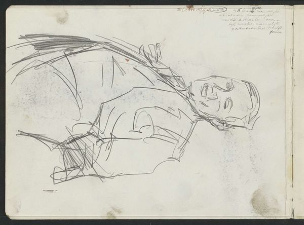 Curator: Let's discuss this intriguing sketch entitled "Man op klompen met een hark," or "Man in Clogs with a Rake," attributed to Jozef Israëls. The museum estimates it was created sometime between 1834 and 1911. It appears to be a pencil drawing on paper. Editor: Immediately, I'm drawn to the rawness of the sketch. It feels so immediate, almost as if we’re glimpsing the artist’s initial idea. The simplicity in its execution conveys a great deal. Curator: Israëls often focused on the lives of the working class. Given the subject’s clogs and rake, and the fact that Israëls was a key figure in the Hague School which portrayed Dutch peasants, we can speculate on how this piece reflects social realities and identities. How might a peasant have viewed their position within Dutch society during this period? Editor: Focusing on the visual, observe the strategic use of line to imply form. There's a compelling tension between the defined contours of the man's clogs, which feel quite deliberate, and the looser, almost frantic, lines used to depict his body and the rake. Semiotically speaking, it almost feels like the artist prioritizes those cultural signifiers. Curator: That tension you observe resonates with the socioeconomic reality of the period. While industrialization was advancing, the agricultural sector, where someone wearing clogs would work, experienced intense transformations, and for some this would imply intense precarity and hardship. Do you see the somewhat rushed rendering you described as symbolic of labour exploitation? Editor: It’s fascinating to consider. One could also read the unfinished quality simply as a preliminary study—a way for the artist to work through spatial arrangements or test the pose of the figure. A more abstract reading sees the lack of embellishment as stripping away any distractions and offering the very essence of the subject’s humanity. Curator: That resonates, certainly. Perhaps the 'unfinishedness', that stripped-down essence, highlights how easily such labouring bodies could be dismissed and dehumanized. Israëls’ art aimed to bring visibility to these overlooked lives, challenging viewers to consider the worth and dignity inherent in every individual, regardless of class or occupation. Editor: It’s a valuable insight. This little drawing holds a mirror to both its own aesthetic choices and to the historical context that shaped it, inviting multiple interpretations. Curator: Precisely. And through interrogating Israëls’ choices and contextualising them, perhaps we allow contemporary audiences to grapple with the enduring questions around class, identity, and representation within our societies.