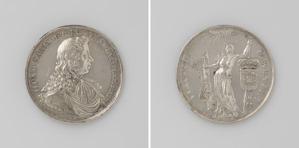 This medal commemorating the Death of William III was made around 1702, probably in the Netherlands, by Jan Boskam, from silver. The silver’s cool, reflective surface highlights the crisp details of Boskam's engraving. The medal's small scale invites close examination, revealing the fine lines that define William III's profile and the allegorical scene on the reverse. Minting coins and medals was a highly skilled craft, requiring careful design and execution, reflecting a deep understanding of metallurgy and engraving. Boskam was a master of his tools, using punches, dies, and delicate chisels to create intricate and symbolic imagery. The choice of silver as a material isn’t accidental. The medal is not just a work of art, but a potent symbol of power, wealth, and remembrance. It transcends the boundaries between art, craft, and social commentary, offering insights into the politics, and commemorative practices of its time.