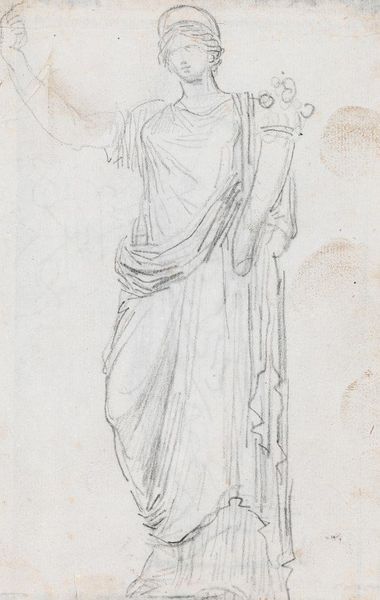 Alvin Gully created this drawing of a Circus Wagon Figure with graphite and watercolor. The composition emphasizes verticality, drawing our eyes upward along the figure's draped form to her serene face. The monochromatic palette evokes a sense of antiquity, resembling aged stone. The structural arrangement divides the figure into distinct sections: the detailed base, the flowing drapery of the body, and the composed upper torso. This division invites semiotic interpretation: The base, adorned with a wreath, symbolizes triumph, the draped body conveys classical virtue, and the gesture of holding a flower connects to themes of beauty and ephemerality. The interplay between the static pose and the implied movement of the drapery destabilizes a fixed reading. The classical form is re-interpreted as a dynamic figure, challenging traditional sculptural representation. The drawing prompts us to consider how established meanings are reconfigured through subtle shifts in form and composition.