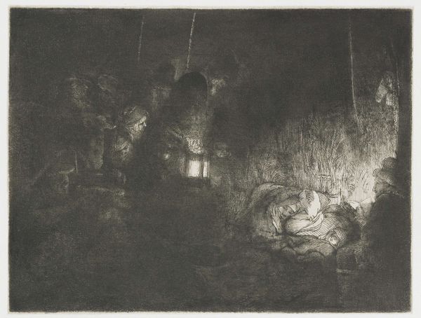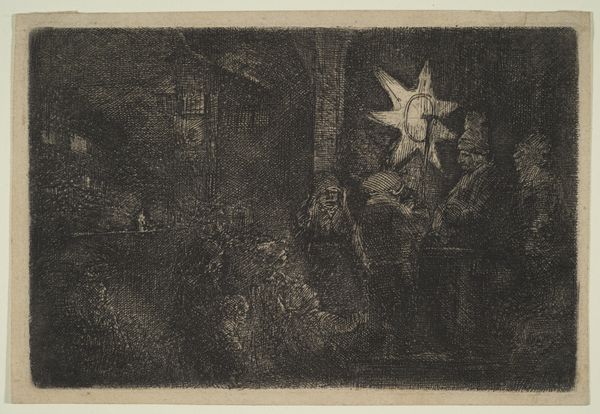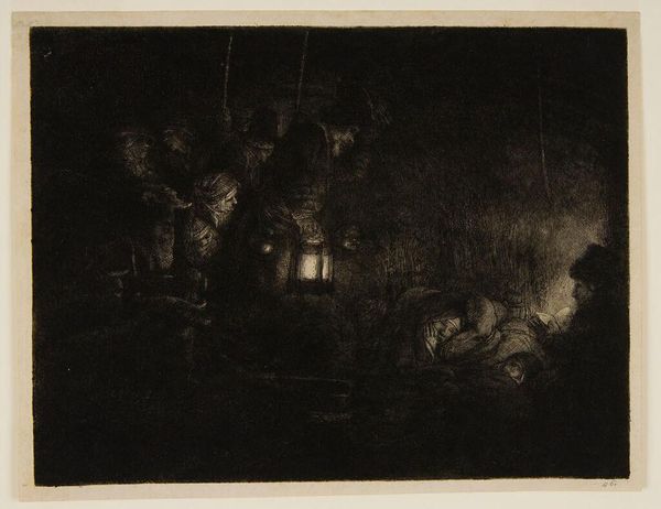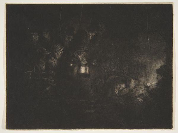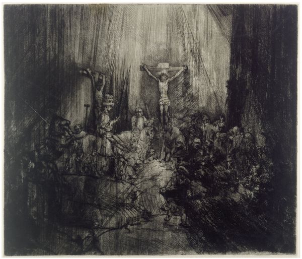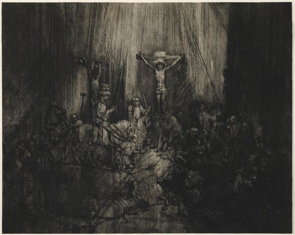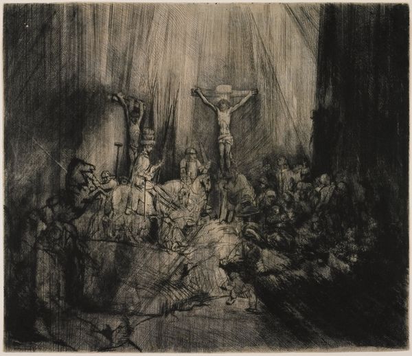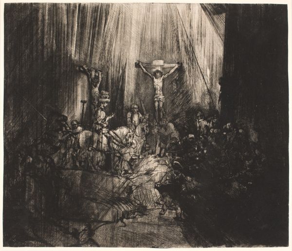 Editor: This is Rembrandt van Rijn's "Christ Crucified between the Two Thieves," also known as "The Three Crosses," an etching from 1653. It’s intensely dark and dramatic. What social commentaries do you see present in this piece? Curator: Rembrandt’s choice to depict the crucifixion through stark light and shadow holds powerful commentary, wouldn't you agree? It prompts us to consider who is illuminated and who is cast into darkness, both literally and metaphorically. Who are those figures cloaked in light, those centered, and what power dynamics are at play within that social hierarchy? Editor: That makes me think about the figures in the shadows. Are they meant to represent those marginalized or ignored by society? Curator: Precisely. Rembrandt was working in a time of social upheaval and religious reformation. How might this context inform his artistic choices? Think about how this scene plays out from different points of view, beyond those typically shown in works from that period. Editor: Maybe it's a commentary on those in power, questioning their role and responsibility in the face of suffering? And, it makes me wonder what his intentions were regarding religion... I mean, showing the point of view of all sorts of bystanders, not just the divine one... Curator: Yes, Rembrandt, as an astute observer of humanity, pushes us to examine the institutional structures of power and privilege present within religious and social spheres. Consider too how art's role can be an instrument for sparking difficult but critical social discourse. Editor: So the composition itself is a challenge to established power dynamics. I see the piece so differently now! Thank you. Curator: It goes to show that visual narratives can both reflect and challenge the status quo. Thinking critically about that can lead to richer cultural engagement.