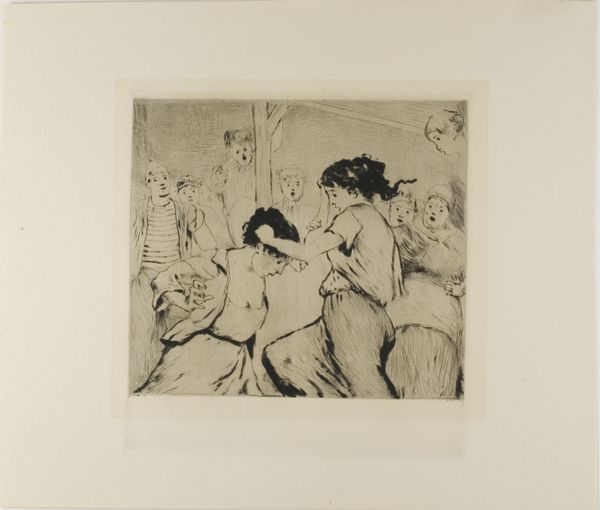Curator: Michael Mazur's "The Corridor, Plate II," held at the Harvard Art Museums, presents a study in charcoal and ink. Its starkness strikes me immediately. Editor: Yes, the visual language speaks volumes; there's a pervasive sense of anxiety, almost a psychic weight. The figures seem trapped, faceless. Curator: The rough hatching and blurring contribute to this effect; it feels raw, immediate. Consider the process, the artist's hand actively marking and smudging. Editor: Right, and these figures receding into the corridor, they become symbols of displacement, of a journey without clear destination. The corridor itself becomes a metaphor. Curator: Perhaps Mazur is suggesting the alienated conditions of modern labor, the dehumanizing effects of institutional architecture. Editor: Maybe. Or maybe it's the universal, symbolic weight of the corridor itself, a liminal space between worlds. Curator: Well, whatever the reading, "The Corridor" provides insight into the material conditions that gave rise to this work. Editor: For me, it's about the journey itself, the emotional resonance of those figures within that space.