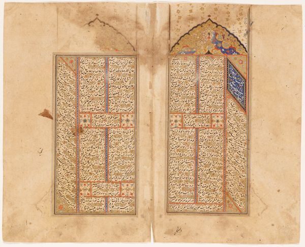 This sumptuous double frontispiece has survived from a Kolliat manuscript originally written by the great Persian poet Sa'di. Illuminated opening pages such as these are typical of the ornate chapter headings, embellished script, and marginal decorations that frequently graced the Koran and other religious manuscripts, as well as literary classics. The decoration consists of a wide floral arabesque framing the central rectangular unit, which is, in turn, divided into three fields by braided and floral bands. Each of these units bears inscriptions in ornate cursive script. These two pages demonstrate a highly developed sense of design and an extraordinary virtuosity in the application of colors and gold leaf.
