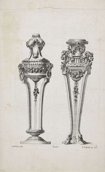 Editor: So, this is "Tripod en twee vazen," or Tripod with Two Vases, by Francesco Piranesi, dating from 1779 to 1780. It’s an etching and engraving, currently held at the Rijksmuseum. The precise lines and classical forms give it this air of serious formality... What do you see when you look at it? Curator: Ah, Piranesi! A master of making the past present, isn't he? It reminds me of those summer afternoons spent tracing the cracks in Roman pavements. Here, it feels as if he’s not just showing us these objects but summoning them, isn’t it? I mean, you've got the clear Neoclassical lines trying to capture this essence of antiquity. Almost a ghostly attempt to grasp the grandeur of lost civilizations through perfect lines. Doesn't it give you that feeling of bittersweet longing? Editor: A bittersweet longing… I get what you mean! It's like he's trying to reconstruct a feeling, more than just illustrating objects. Almost like architectural or design documentation? Curator: Precisely! He's more poet than draftsman. Do you notice how the stark lines, though precise, somehow fail to fully capture the textures? It makes me think about how inadequate our attempts to preserve beauty truly are. It’s like memory itself— fragmented and idealized. What do you make of that? Editor: That actually makes me appreciate it a lot more. At first, the rigid style felt a little cold, but now I can see the emotion in its imperfections. I initially felt like it had that design documentation kind of mood to it, but now I see more poetry in the medium. Curator: Exactly! Isn’t it wonderful when art tricks us like that? It's like peering through a keyhole, seeing not just the room but the soul of a lost world.