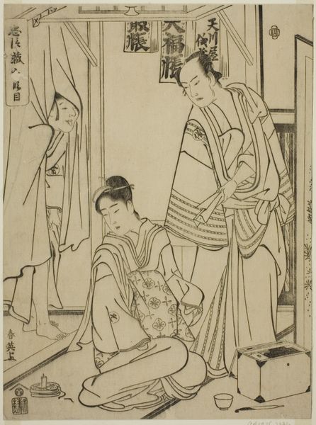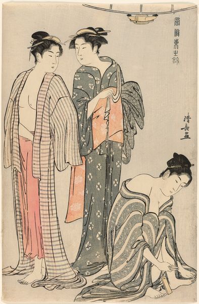 Torii Kiyonaga created this woodblock print titled "Cutting the Toenails; the Toilet after the Bath" in Japan sometime between 1752 and 1815. During the Edo period, Kiyonaga was known for portraying women of the merchant class engaged in everyday life, like here in the depiction of a private, after-bath ritual. What is striking about this image is its tender portrayal of women's quotidian experiences and their bodies. Rather than presenting idealized or eroticized figures, Kiyonaga captures a moment of casual intimacy and self-care. The women here are not goddesses or courtesans, but relatable figures performing the mundane task of personal grooming. In representing the female body so frankly, Kiyonaga challenges traditional representations of women in art. The print suggests that there is beauty and value in the everyday lives of women. Despite the passage of time, the image invites us to reflect on our own rituals of self-care, and the value of representing women's lived experiences with empathy and nuance.