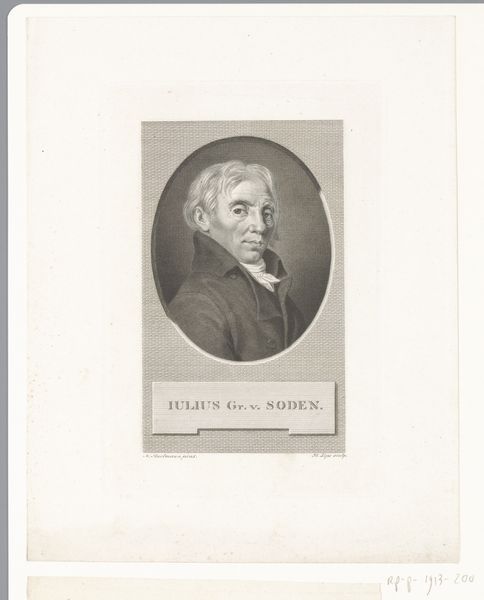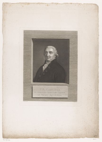 Martin Esslinger created this portrait of Johann Jakob Hottinger, a professor and canon in Zurich, using etching techniques. Esslinger, working in the early 19th century, situated himself within a society undergoing significant transformation, influenced by Enlightenment ideals and the rise of Romanticism. Portraits like this offer a glimpse into the construction of identity and status during this period. As a professor and canon, Hottinger occupied a position of intellectual and religious authority. Esslinger's portrait captures Hottinger's likeness and signifies his social standing through formal attire and composed demeanor. The emotional content of the work is subtle. Hottinger's expression is neutral, almost stoic, reflecting the values of rationality and restraint associated with his roles. Yet, there is a certain depth in his gaze that suggests the inner life of a scholar dedicated to his work. This image stands as a cultural artifact, reflecting both the personal identity of its subject and the broader societal values of 19th-century Zurich.
