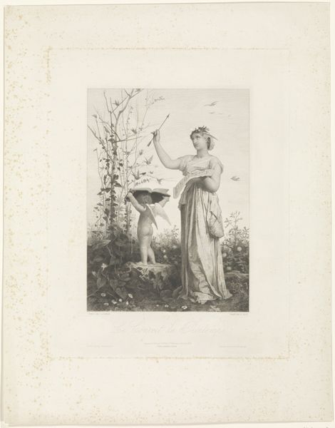 Editor: This is Hermann Eichens' "Maria Magdalena treurend aan het kruis," an engraving from somewhere between 1827 and 1879. The composition, with its archway framing Mary Magdalene, really emphasizes her isolation and grief. What can you tell me about this work? Curator: It’s essential to recognize that Eichens, working in the Romantic era, grapples with the portrayal of women in religious contexts, continuing centuries-long art traditions that reflected complex gender dynamics and often restricted women's roles. This image, on the surface, appears devout, but what happens if we read Mary's emotional display not just as religious fervor, but as an expression of social constraints imposed on women of that era? Editor: That's an interesting way to approach it. It makes me wonder if the focus on her emotional distress is highlighting, rather than simply depicting, her limited agency. Curator: Precisely. Think about the prevailing cultural narrative of the time. How might Eichens' choice to depict Mary in this vulnerable state comment on the societal expectations placed on women, where displays of emotion were sometimes their only permitted form of expression or power? Is this image actually reinforcing or subverting those expectations? Editor: So, instead of a straightforward religious image, it's prompting us to question the role of women within the church and society at large? Curator: Yes. It allows us to analyze how art becomes a vehicle for social commentary, consciously or unconsciously reflecting and potentially challenging the established power structures of its time. These historical depictions offer potent insight into the ongoing conversations around gender, religion, and representation. Editor: This gives me so much to consider regarding the relationship between art and the cultural contexts it emerges from! Curator: Absolutely. Bringing those social contexts into our art analysis makes for a richer and more complete understanding.