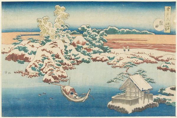 Curator: This is "The Sound of the Lake at Rinkai," a woodblock print by Katsushika Hokusai, dating from around 1832. It's currently held in the collection of the Minneapolis Institute of Art. Editor: My goodness, it's like a dream! The colors are so soft, almost faded, giving it this incredibly peaceful, ethereal feel. The winding path almost feels like a whispered invitation. Curator: It’s part of a series exploring different landscapes, reflecting the growing interest in leisure travel among the merchant classes in Edo-period Japan. Hokusai captures a sense of place, but also the feeling of escape and contemplation. Editor: Escape is right! That little boat floating on what feels like glass…it’s utterly hypnotic. I’m imagining myself drifting along, the world reduced to gentle ripples and the faint cries of gulls. There’s a beautiful simplicity here, distilled down to the bare essentials. Curator: Ukiyo-e prints like this one weren't considered high art at the time. They were mass-produced, affordable, catering to a wide audience seeking entertainment and connection with famous landscapes. Think of them as the postcards of their day. The printing process itself also allowed for incredible precision and detail. Editor: It makes you think, doesn’t it? Art for everyone. Imagine what it must have felt like to hold one of these and dream of faraway places, rendered so beautifully with just a few blocks of wood and some ink. It seems fitting this view comes down to us as 'The Sound of the Lake' which gives our other senses freedom to feel something personal from the image. Curator: Precisely. And Hokusai was a master of capturing not just visual accuracy, but also mood. He taps into this deep well of longing, of seeking solace and beauty in nature. He really gave his audience what they craved. Editor: Absolutely, standing here with the artwork it invokes a tranquil scene; with the right set of meditative ears, that body of water really would emit 'the sound of the lake'. Such a moving artwork that transcends time! Curator: It reminds us how art, even when mass-produced, can connect us to profound human experiences. A testament to Hokusai's skill, no question.